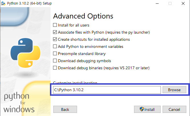 - 설치될 경로를 직접 설정하려면 Customize insallation 을 선택한다
